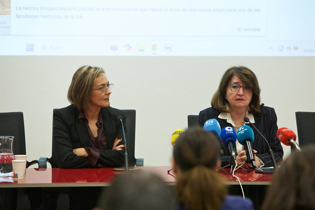 La rectora de la UA, Amparo Navarro (d), ofrece una rueda de prensa durante el encuentro con medios de comunicación - UA
