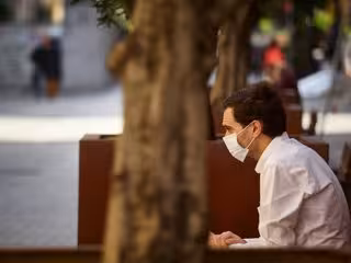 Un hombre con mascarilla descansa sentado en un banco durante el segundo día de la fase 0 de la desescalada en la que se permite la apertura con limitaciones de algunos establecimientos, en Pamplona/Navarra (España) a 5 de mayo de 2020. - Eduardo Sanz - Europa Press