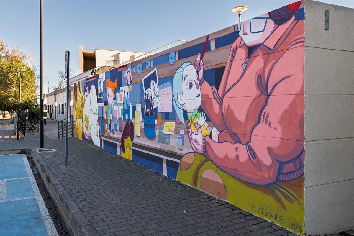 El mural está inspirado en algunos de los 'ninots' y escenas ganadoras de las dos ediciones celebradas hasta el momento del concurso 'La Ciència a les Falles', en la categoría de fallas infantiles.