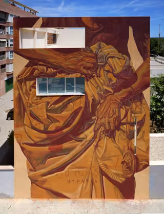 Este trabajo es obra de la artista argentina Milu Correch y está plasmado con la técnica tradicional de mural. La pieza representa a Hipatia con referencias directas a su trayectoria, por lo que incluye un astrolabio y diferentes letras que remiten a las cartas que recibía de la aristocracia de la época, ha explicado Las Naves, que ha indicado que además refleja su "carácter reivindicativo".