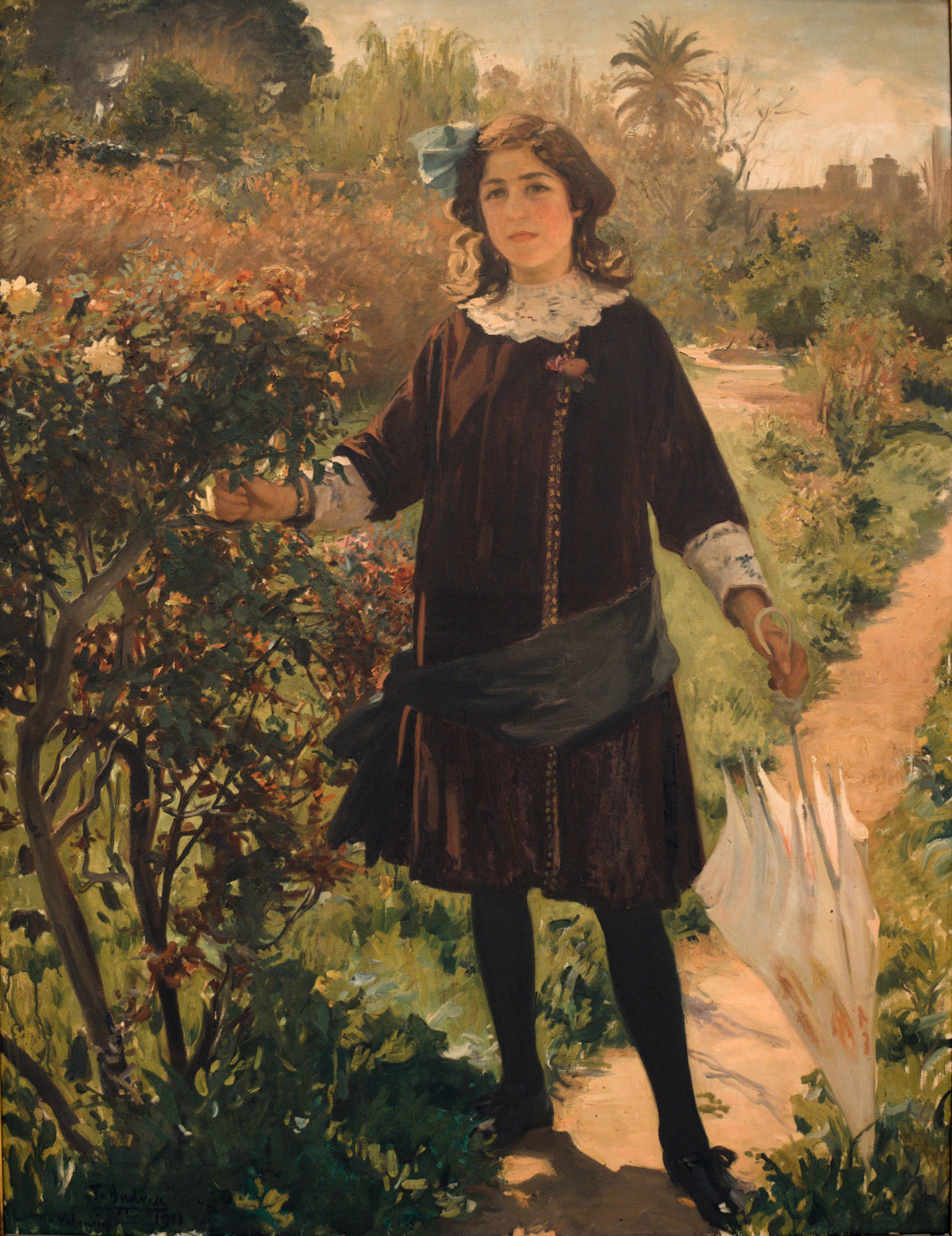 El reconocido discípulo de Sorolla pintó este óleo sobre lienzo en 1911 por encargo de los padres de la retratada y es muestra del característico tratamiento de la luz, propio del artista y del periodo.