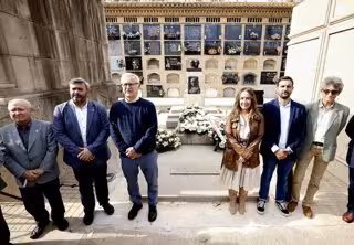 El alcalde, Joan Ribó, acompañado de la concejala de Patrimonio y Recursos Culturales, Gloria Tello, y el concejal de Cementerios y Servicios Funerarios, Alejandro Ramon, ha participado en la ofrenda floral a la tumba del escultor valenciano Mariano Benlliure, en el Cementerio del Cabanyal, en el 75 aniversario de su fallecimiento.