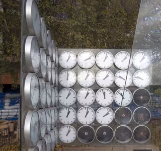 El monumento, valorado en 18.500 euros, es obra de la artista alemana afincada en València Anja Krakowski y está formado por cuatro tabiques de vidrio laminado, montados en dos ángulos de 90 grados sobre muretes de hormigón. Sobre ellos se sitúan 43 relojes blancos, uno por cada víctima, que señalan la hora en que se truncó su vida, a las 13.03 horas, y siete relojes negros.