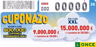 Por tres euros, este sorteo ofrece todos los viernes un premio a las cinco cifras más serie de nueve millones de euros, y seis segundos premios de 100.000 euros a otras tantas extracciones, también con serie. Si se opta por el Cuponazo XXL, por cinco euros, el premio sube a 15 millones y 200.000 euros, respectivamente.