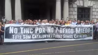 La manifestación de València, convocada por la plataforma Recortes Cero, ha estado encabezada por una gran pancarta con la consigna 'No tinc por/ No tengo miedo; Tots som Catalunya/ Todos somos Cataluña', acompañada a su vez por una segunda pancarta de la Plataforma Intercultural de España (PIE).
