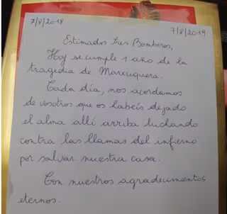 "Estimados bomberos, hoy se cumple un año de la tragedia de la Marxuquera. Cada día nos acordamos de vosotros, que os habéis dejado el alma allí arriba luchando contra las llamas del infierno por salvar nuestras casas. Nuestros agradecimientos eternos", manifiesta en el escrito.