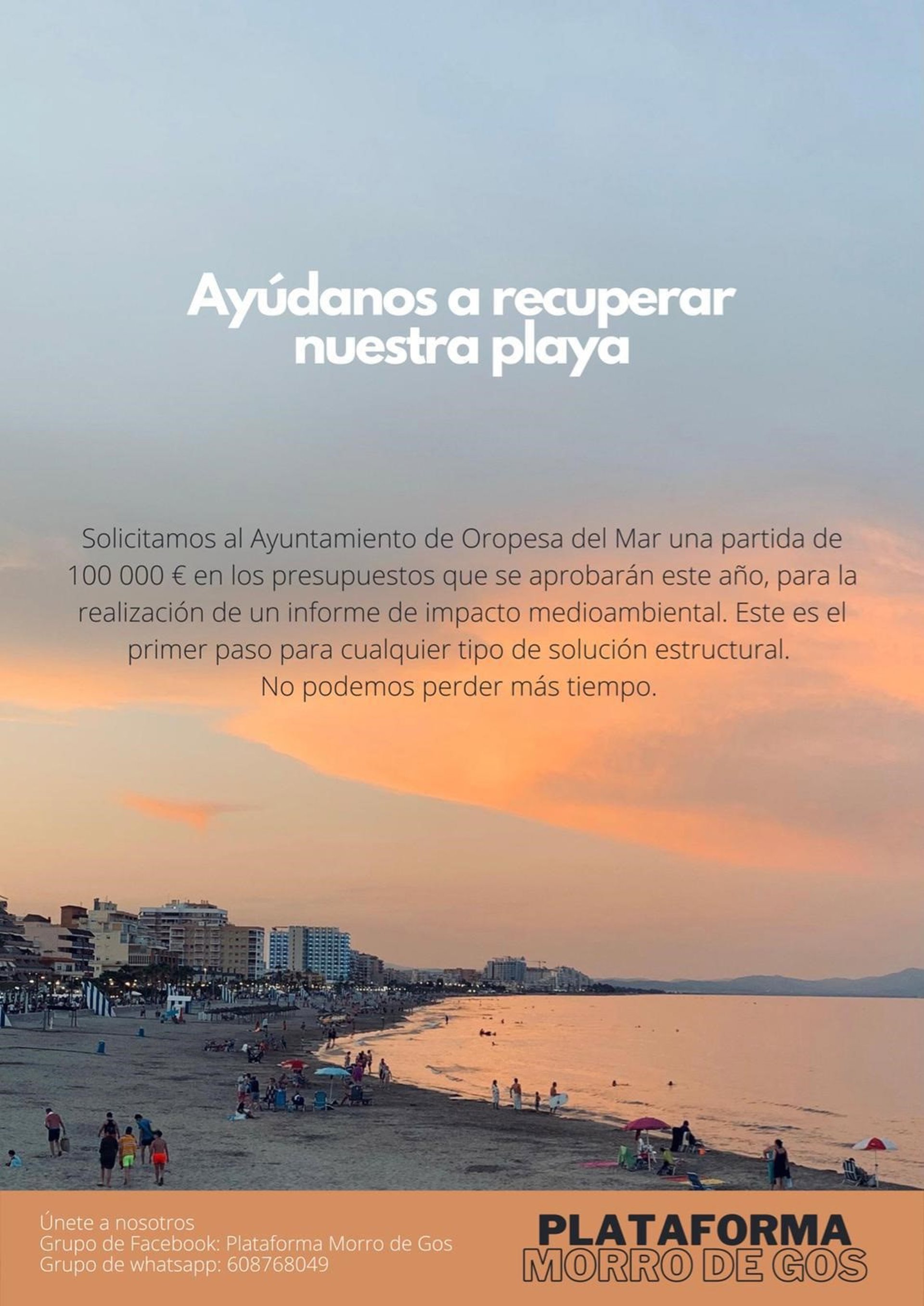 La primera de las iniciativas que se ha llevado a cabo en forma de protesta es la recogida de firmas organizada desde la Plataforma Morro de Gos para "pedir que con carácter extraordinario que se destine una partida de 100.000 a la realización de un informe de impacto medioambiental" que han asegurado van a "presentar en todas las instituciones".