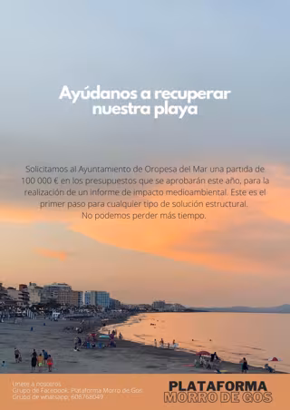 Las comunidades de vecinos de la playa Morro de Gos de Oropesa del Mar (Castellón) han creado una Plataforma ante el estado "lamentable" en el que se encuentra el litoral del municipio y la falta de colaboración del Ayuntamiento de la localidad para paliar la situación.