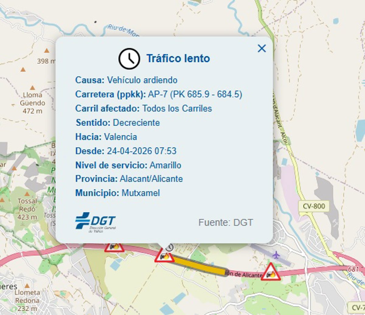 Un vehículo incendiado complica este viernes la circulación en la AP-7, a la altura del municipio alicantino de Mutxamel, según ha informado la Dirección General de Tráfico (DGT).