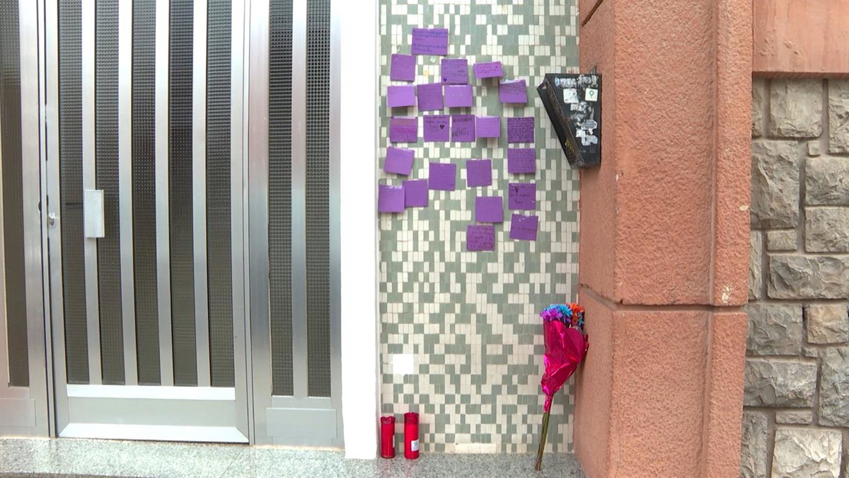 Dos velas, un ramo de flores y mensajes de niños de un colegio cercano han cubierto la puerta del edificio de Sagunt (Valencia) donde residía la mujer de 34 años asesinada presuntamente por su expareja este miércoles, en presencia de su hija de 13 años que se encuentra herida de gravedad en el hospital tras precipitarse desde el segundo piso.