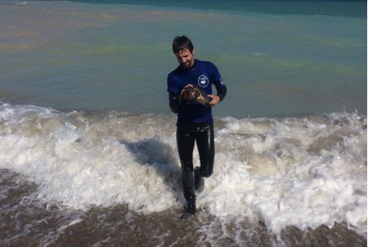 La joven tortuga estaba herida en el cuello y no tenía fuerzas para alcanzar la arena ni para ganar fuerza al oleaje y adentrarse mar adentro.