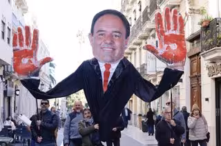 Los participantes han coreado consignas como "no es solución la mano derecha de Mazón" y "el 'president' a Picassent". También se ha podido ver el gran muñeco con las manos manchadas de sangre que es habitual en todas las protestas por la dana, y que esta vez llevaba la cara del candidato Juanfran Pérez Llorca.