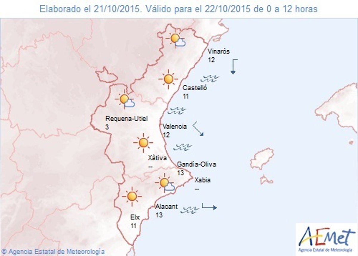 El mercurio seguirá descenderá por la noche algún grado, y bajará hasta los 3 grados en Requena o los 4 grados en Morella, mientras que las diurnas subirán entre 1 y 2 aunque no superarán los 22 grados. El viento será variable flojo en general.
