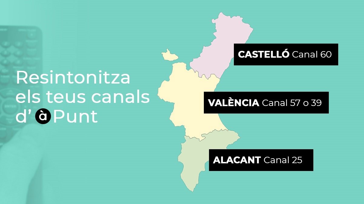 El cambio afecta tanto a la emisión convencional como a los canales de alta definición. En concreto, los canales de referencia de À Punt son el 57 o 39 en la provincia de Valencia, el 25 en Alicante y el 60 en Castellón.