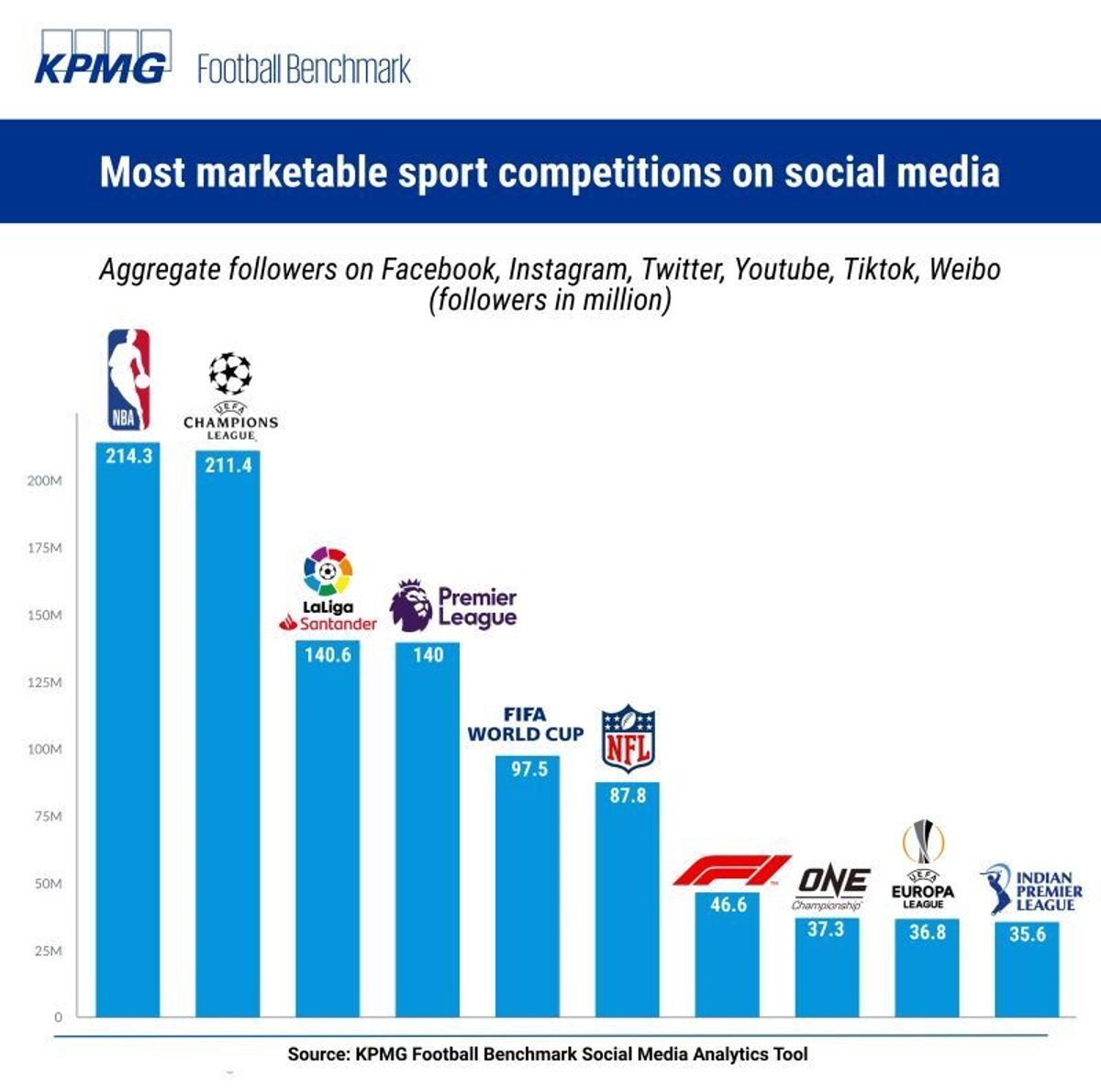 LaLiga es la liga de fútbol con más seguidores en redes sociales, en concreto 140,6 millones, mientras que es la tercera competición deportiva con más fans en los canales sociales, por detrás de la NBA (214,3 millones) y la Liga de Campeones (211,4 millones), según un estudio publicado este miércoles por KPMG Football Benchmark que analiza Facebook, Instagram, Twitter, YouTube, TikTok y Weibo.