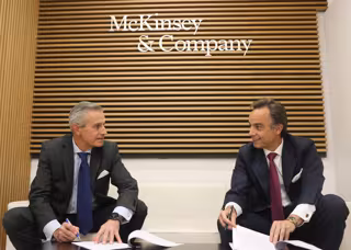 El presidente de McKinsey, Alejandro Beltrán, y el de Europa Press, Asís Martín de Cabiedes, han firmado en la sede de la consultora el acuerdo de colaboración que establece el marco que dará cabida a empresas líderes como Acerinox, Amazon Web Services, BBVA, Correos, Esade, Ferrovial, IKEA, GSK, Merlin Properties, Santander y Telefónica, abierto a la incorporación de nuevas firmas.
