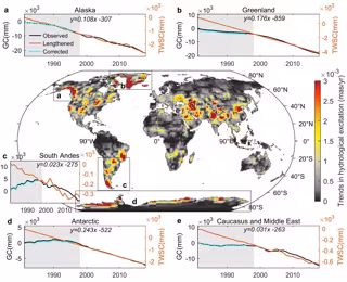 Ahora, los investigadores han encontrado una manera de retroceder en el tiempo el análisis moderno de seguimiento de polos para saber por qué ocurrió esta deriva. La nueva investigación calcula la pérdida total de agua terrestre en la década de 1990 antes de que comenzara la misión GRACE.
