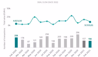 En el mes de febrero se han registrado 156 fusiones y adquisiciones, entre anunciadas y cerradas, por un importe agregado de 9.553,01 millones de euros.