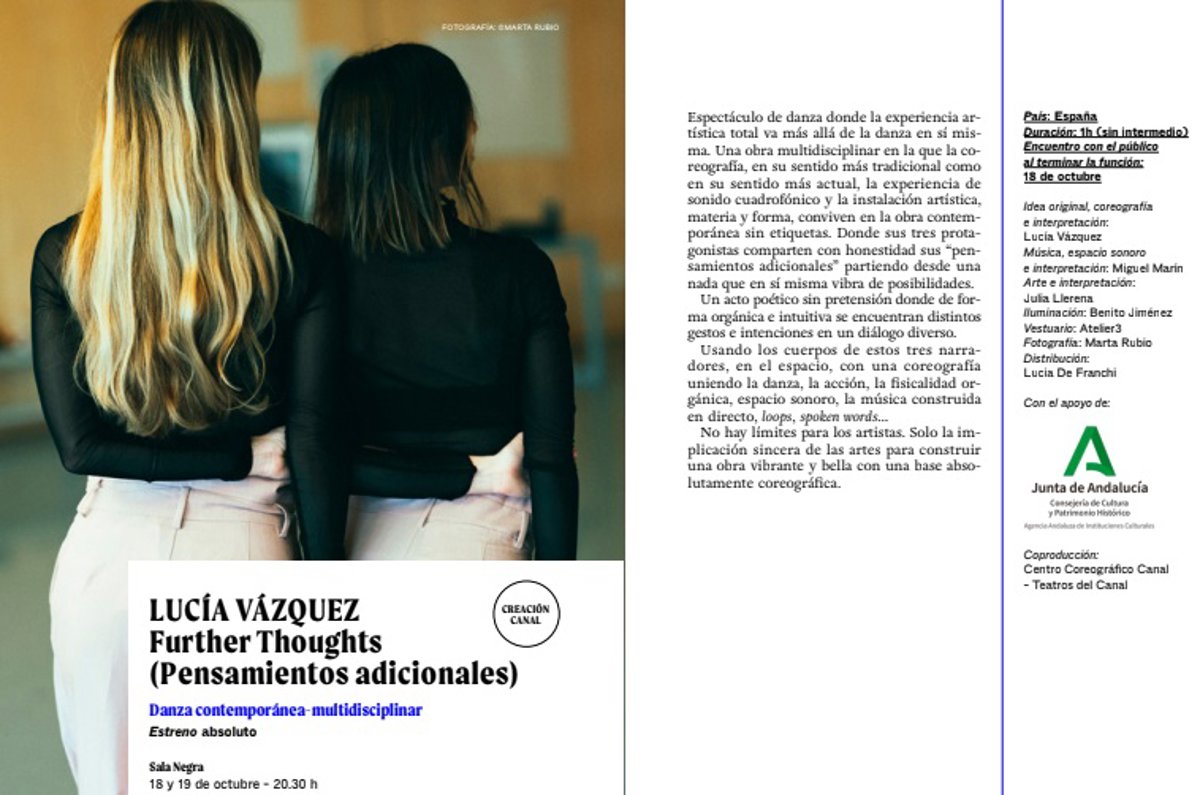 'Further Thoughts' tendrá su estreno absoluto los días 18 y 19 de octubre, a las 20.30 horas, en los Teatros del Canal de Madrid, en el marco del ciclo Canal Baila, en el que este espacio muestra las creaciones de las compañías residentes del Centro Coreográfico Canal, entre las que se halla la de Lucía Vázquez.