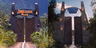 Tal y como ilustra la imagen comparativa que encabeza estos párrafos, prácticamente idéntica, la entrada al nuevo parque de atracciones jurásico es el primer gran homenaje a la película original.