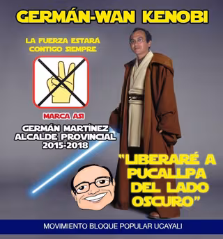 Vestido de caballero Jedi, empuñando un sable de luz y bajo el pseudónimo de Germán-Wan Kenobi. Así aparece Germán Martínez, político peruano candidato a la alcaldía de la ciudad de Pucallpa, en sus carteles electorales.