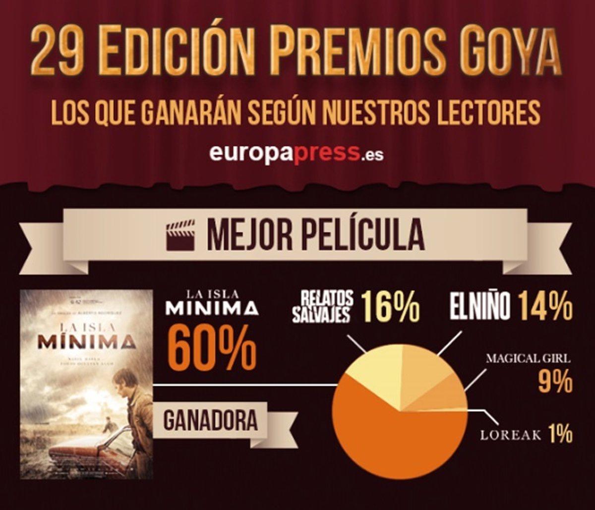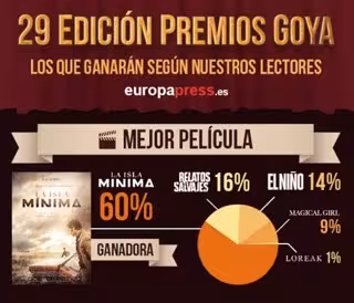 Los lectores de Europa Press tienen muy claro qué título será el vencedor en la 29ª edición de los Pemios Goya. La isla mínima es la película que parte como gran favorita para triunfar en la gala de las galas de nuestro cine que se celebra este sábado. ¿Pensarán lo mismo los académicos?