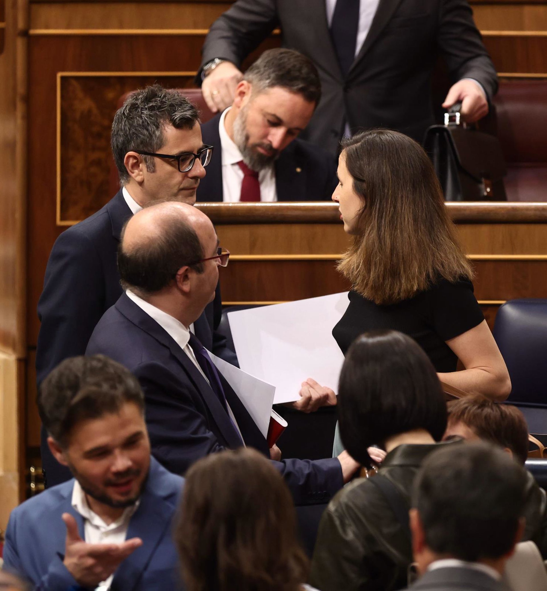 (I-D) El ministro de Cultura y Deporte, Miquel Iceta; el ministro de la Presidencia, Relaciones con las Cortes y Memoria Democrática, Félix Bolaños; y la ministra de Derechos Sociales y Agenda 2030, Ione Belarra, conversan en una sesión plenaria, en el - Eduardo Parra - Europa Press