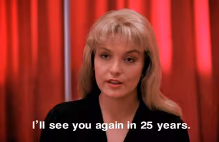Es entonces cuando, de nuevo de negro y rubia, aparece en la sala Laura Palmer. "Hola agente Cooper. Te veré dentro de 25 años. Mientras tanto...", dice Palmer que pone pose zen... y desaparece. El enano se queda con cara de póquer y Cooper algo ojiplático.