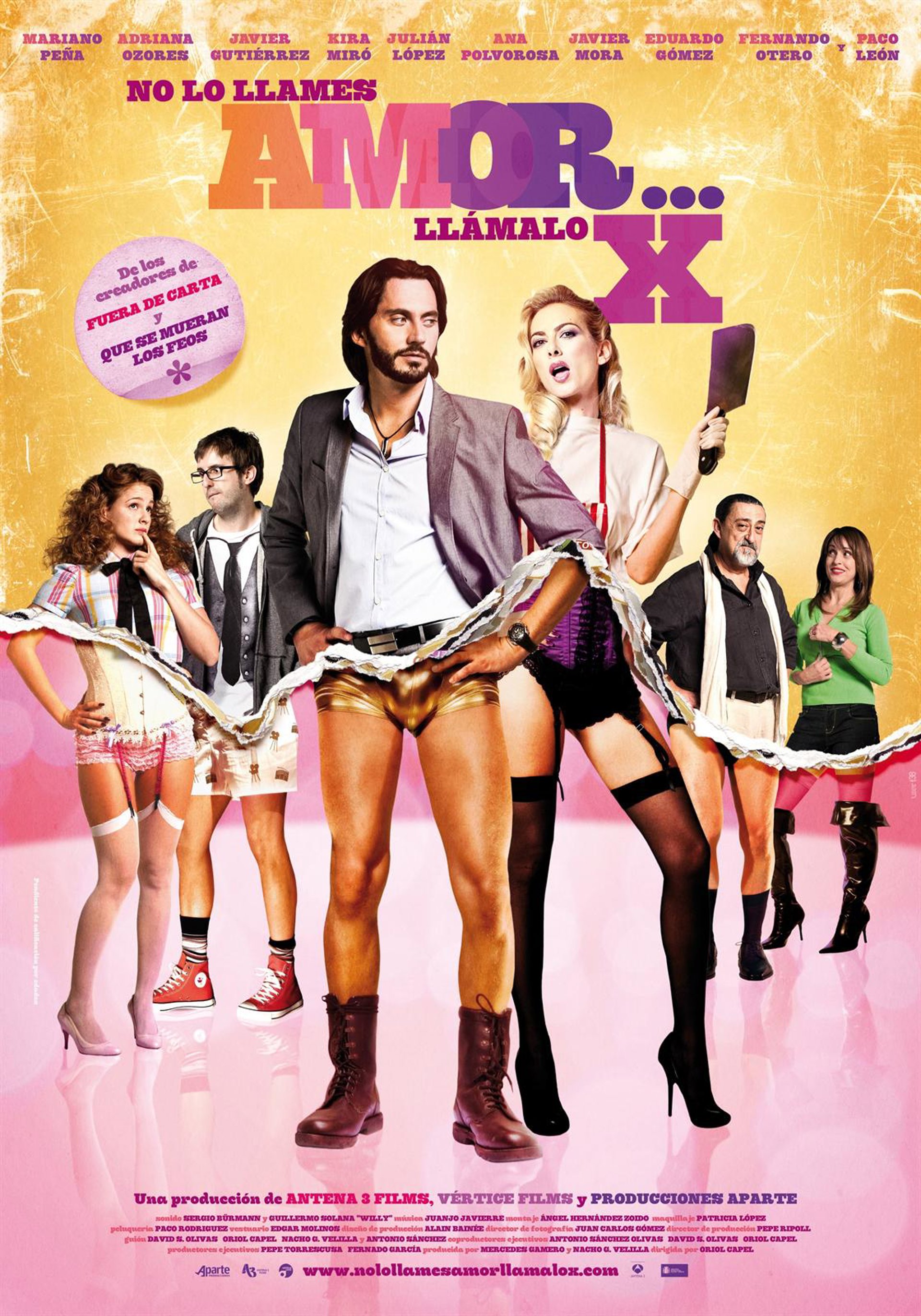 Este viernes llega a los cines 'No Lo Llames Amor Llámalo X', una "comedia porno romántica" de los creadores de 'Fuera de Carta' y 'Que se Mueran los Feos', protagonizada por rostros tan populares como Mariano Peña (Mauricio Colmenero en 'Aída'), Paco León (Luisma también en 'Aída'), Adriana Ozores, Julián López, Ana Polvorosa (Lore en 'Aída'), Javier Gutiérrez, Kira Miró, Eduardo Gómez y Javier Mora. Todos ellos están dirigidos por Oriol Capel.
