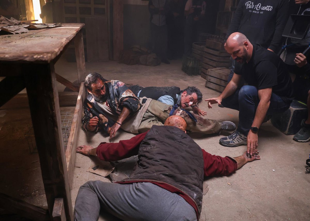 Archivo - Delante del director Albert Pintó (d), los actores Luis Zahera (d), Jesús Carroza (c) y Karra Elejalde (i) durante el rodaje de la película ‘Tierra de Nadie’, en la Finca Cuarto Carretero, a 14 de mayo de 2024, en Galapagar, Madrid (España). ‘Ti - Marta Fernández - Europa Press - Archivo