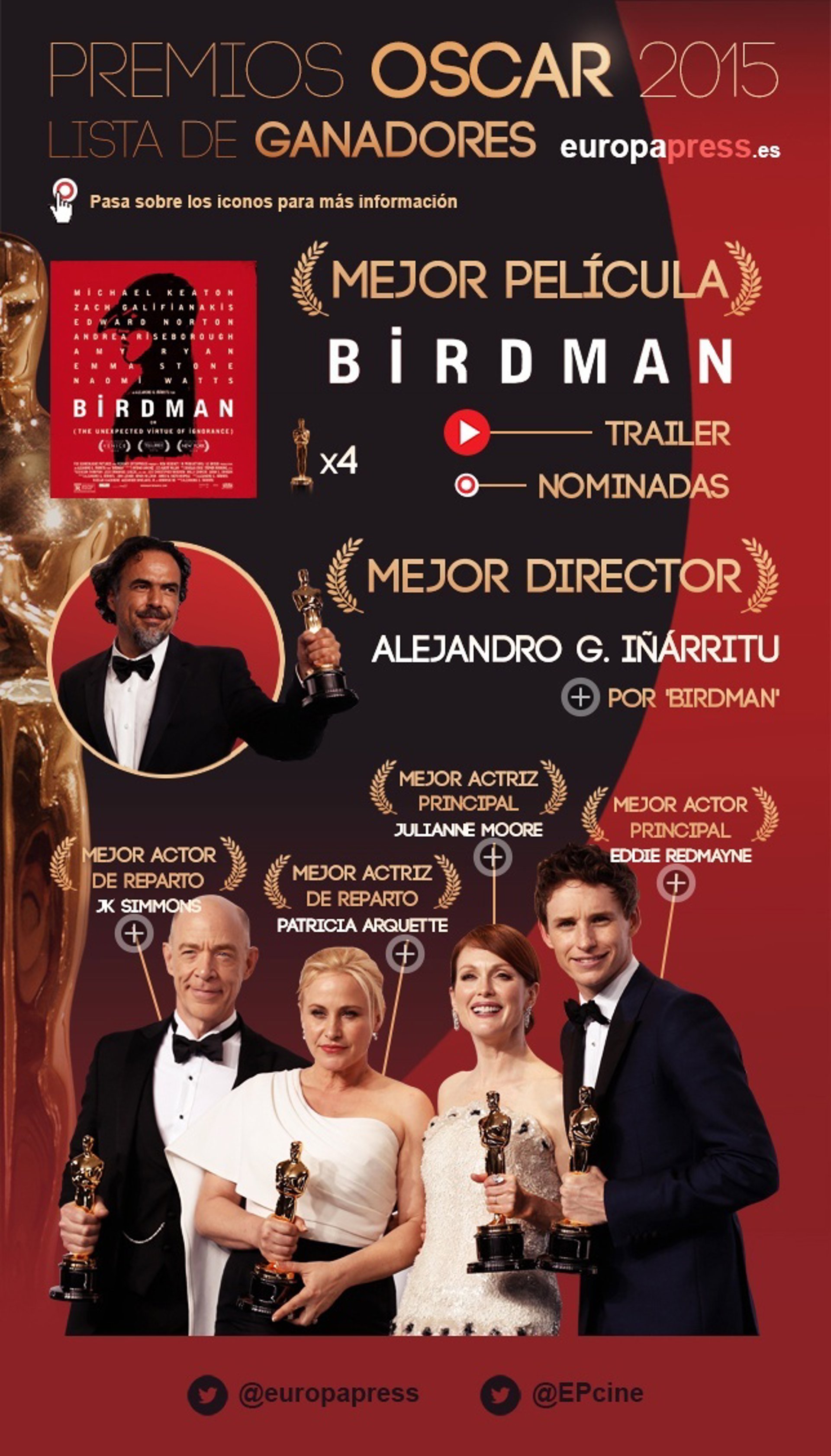 La cinta protagonizada por Michael Keaton partía como una de las grandes favoritas con nueve nominaciones, las mismas que las conseguidas por la película de Wes Anderson. Además de los dos premios gordos (película y director) Birdman se ha alzado también con el Oscar al mejor guión original y mejor fotografía.