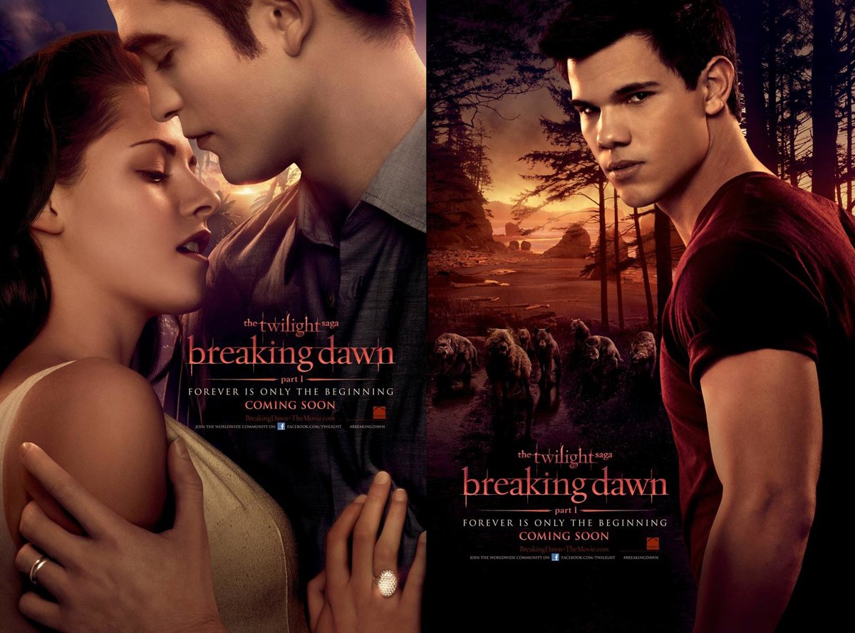 Ya están disponibles los nuevos carteles oficiales de 'La Saga Crepúsculo: Amanecer' (Parte I). En ellos podemos ver a la pareja formada por el vampiro Edward Cullen (Robert Pattinson) y Bella Swank (Kristen Stewart), y al licántropo Jacob Black (Taylor Lautner) con su manada de hombres lobo al fondo.