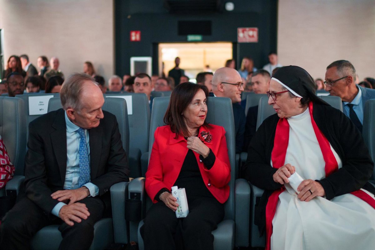 (I-D) El almirante Juan Francisco Martínez Núñez; la ministra de Defensa, Margarita Robles; y Sor Lucia Caram; durante la presentación del documental “Ucrania, resistencia y esperanza”, en el Espacio Movistar, a 22 de octubre de 2025, en Madrid (España). - Matias Chiofalo - Europa Press