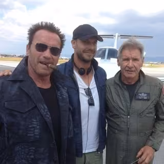 En la imagen aparece el propio Schwarzenegger pertrechado de chaqueta militar oscura, puro en al boca y pelo de punta, junto al director de la cinta Patrick Hughes y Harrison Ford, vestido también con un uniforme militar de aviación.