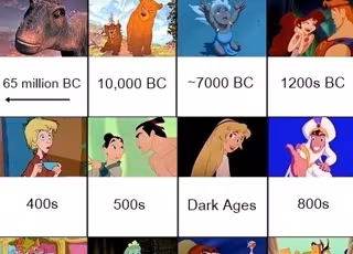 El timeline parte desde la época en que aún existían dinosaurios hasta llegar a un futuro aún muy lejano, pasando por la época de Hércules, Pocahontas, Tarzán...