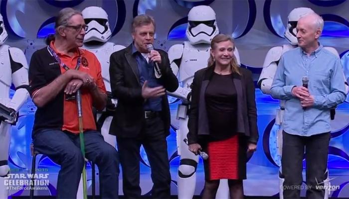 Y después, escoltados por los nuevos Stormtroopers, aparecieron cuatro mitos vivientes de la franquicia: Mark Hamill (Luke Skywalker), Carrie Fisher (Leia), Anthony Daniels (C3PO) y Peter Mayhew (Chewbacca).