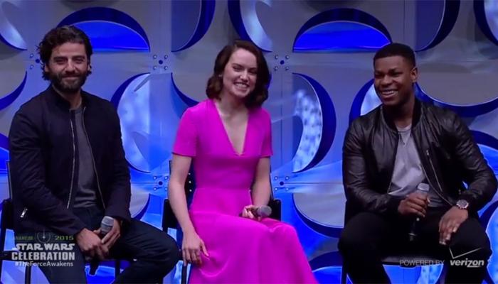 Tras los robots llegó el turno de "las estrellas humanas de la saga". Al escenario llegaron Oscar Isaac (Poe Dameron), Daisy Ridley (Rey) y John Boyega (Finn), los que se presume serán los tres grandes protagonistas de esta nueva entrega.