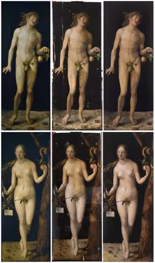Asimismo, 'Adán' y 'Eva', que datan del año 1507, sufrían en sus soportes defectuosos, que habían alterado la percepción de sus tonos y habían abierto grietas pronunciadas en las superficies, como resultado del trabajo ineficaz de sus antiguos 'restauradores'.