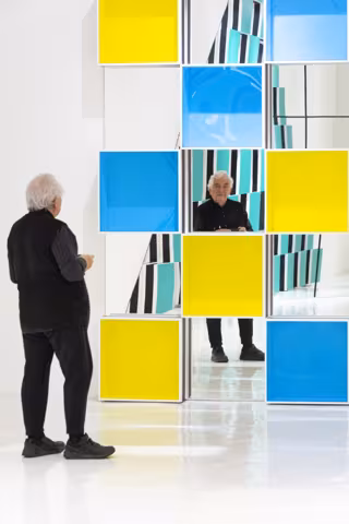 Recientemente, el presidente Macron le encargó una obra para el techo acristalado del pabellón de invierno del Palacio del Eliseo donde no faltaron sus rayas de 8,7 cm con los colores de enseña nacional.