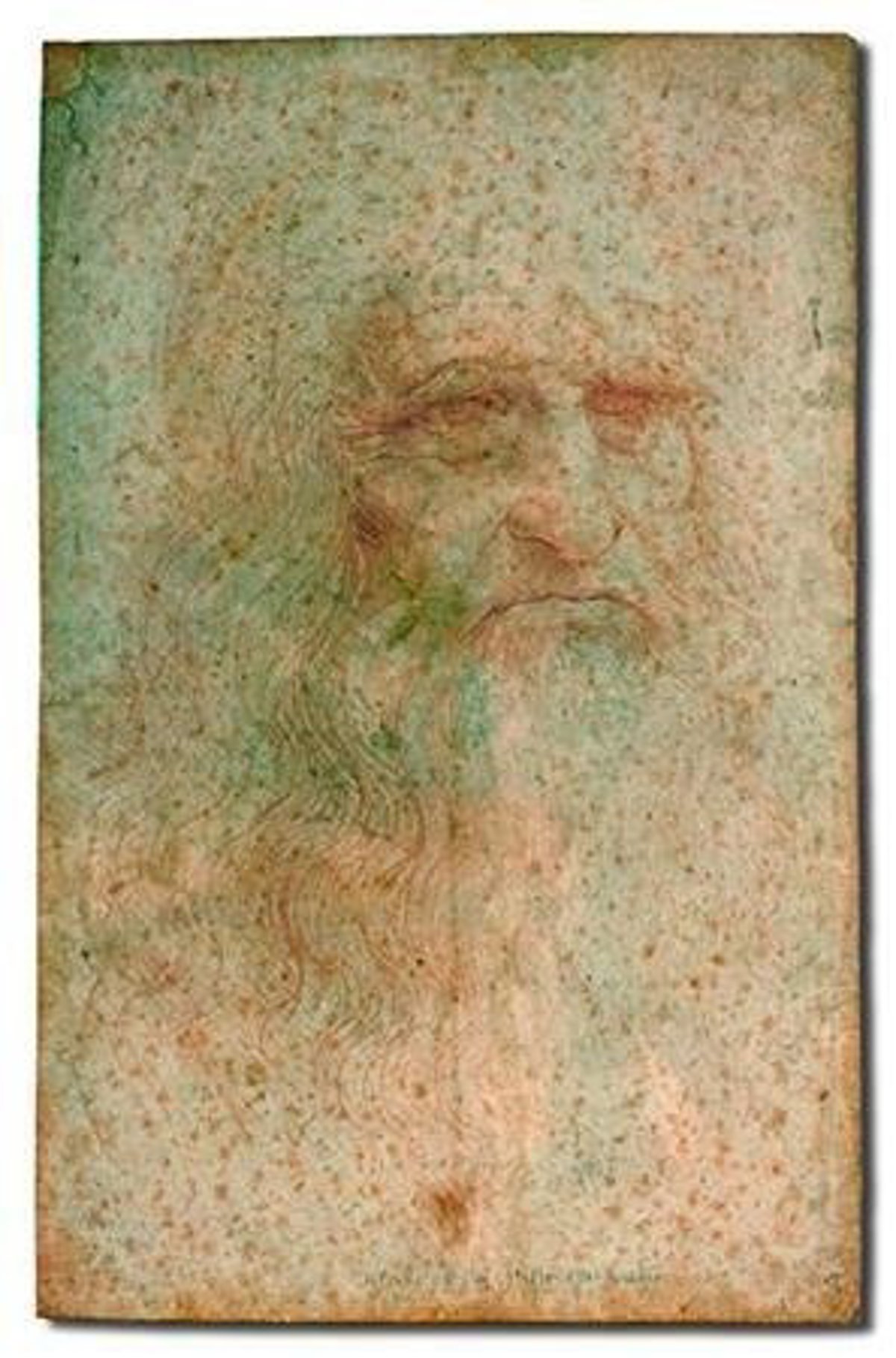 El pequeño retrato del maestro de Renacimiento (que mide 33,5 por 21,6 centímetros) muestra a un Leonardo pensativo, con grandes ojos, cejas pobladas y una larga barba. El autorretrato, hecho con tiza roja sobre papel, sufre rojeces y manchas que no deberían estar ahí.