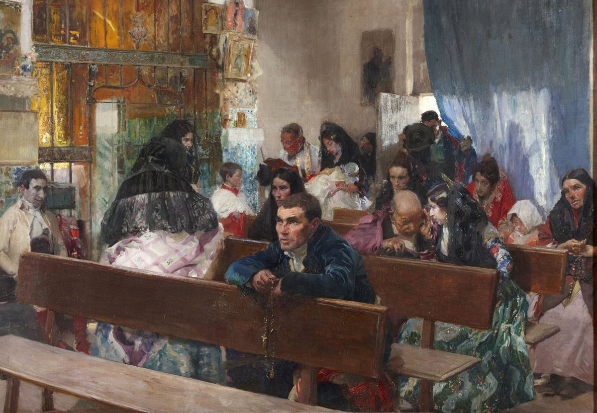 Por ello este 'Bautizo' se aleja de las escenas de playa que marcaron la trayectoria de Sorolla y se concentra en una escena integrada por numerosos personajes con trajes tradicionales que, aún en el marco solemne de una ceremonia, dejan ver el gusto del pintor por lo espontáneo.