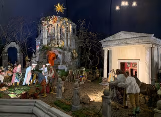 Con estas dos escenas como novedad, el Belén se divide en dos partes, una que representa lo popular, con restaurantes, librerías, mercados y el campo, y otra en la que se expone la nobleza con un jardín clásico y la mencionada galería.