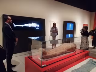 Una de las momias expuestas está ubicada en un sarcófago en el que los dibujos que hay sobre ella también giran en torno a la muerte. "Hemos encontrado en su sarcófago que él también forma parte del viaje del más allá. Hemos descubierto cómo se hizo, esta hecho de 130 piezas de madera, algo muy moderno e inesperado para nosotros y que nos da una idea del trabajo artesano y de las capacidades de la gente de esa época", ha afirmado la comisaria.