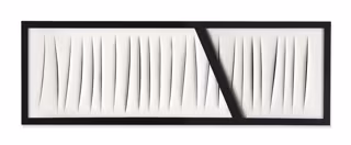 Se trata de un lienzo de dos metros de longitud con 24 cortes, el número más alto de cortes que realizó en una obra. Además, Fontana lo envolvió en un marco de laca negra, lo que le convierte en un objeto único del artista.