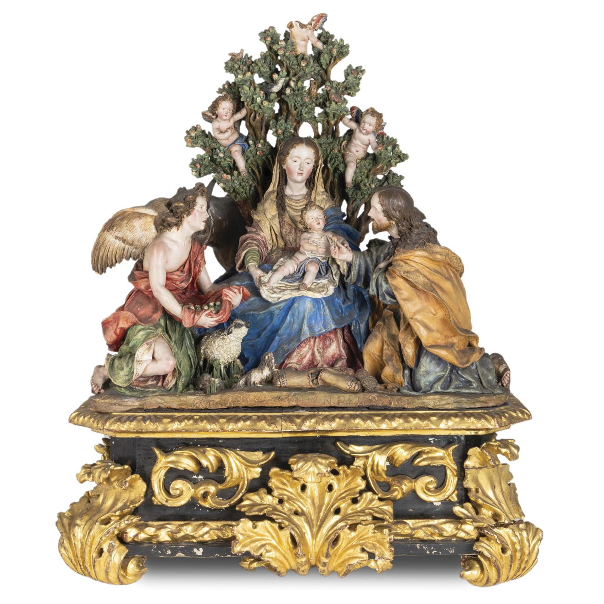 Por otra parte, 'Descanso en la huida a Egipto' irá destinada al Museo Nacional del Prado. Este grupo escultórico realizado en barro cocido y policromado representa el descanso de la Sagrada Familia durante la huida a Egipto. Al igual que el grupo anterior, cuenta con una peana diferente a lo habitual en la producción madrileña de Luisa Roldán, con elementos vegetales tallados y dorados, al gusto napolitano.