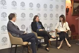 El creador de la Galería Senda, Carlos Durán, la directora de ARCOMadrid, Maribel López, y la directora de la Galería Marlborough, Merc Ros, dialogan en un acto organizado en el Círculo Ecuestre. - CÍRCULO ECUESTRE