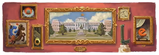 El 'doodle' se puede ver en la página de inicio de Google en más de 30 países. En la imagen se puede ver precisamente la fachada del Edificio Villanueva acompañada de algunos cuadros en los que están 'retratadas' las famosas letras del buscador.