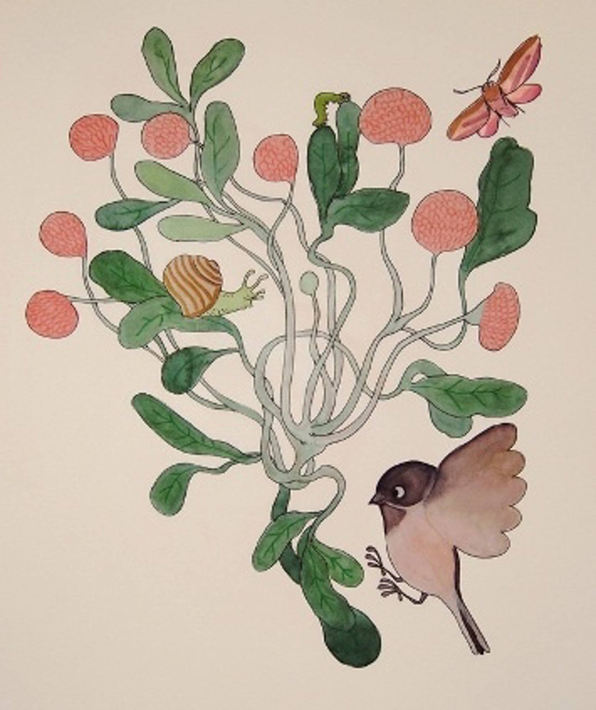 "Cuando era pequeña, los jardines eran lugares fascinantes para mí, como supongo que para la gran mayoría de los niños de ciudad. Me pasaba horas buscando bichitos, recogiendo hojas y palitos. Ver una rana, una lagartija o un polluelo caído del nido era una auténtica fiesta. Mis ilustraciones y pequeños exvotos representan un retorno a lo misterioso, a lo atávico que late en la naturaleza. En definitiva, al jardín perdido", explica la artista.