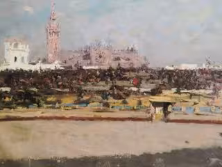 'Plaza de toros de Sevilla' es un óleo sobre lienzo datado en 1868 y de 62x84,5 centímetros, que refleja la atracción que Fortuny sintió por los temas taurinos, y que también plasmó en otras obras como 'Corrida de toros', 'Muerte del toro' y 'Brindis del espada'.