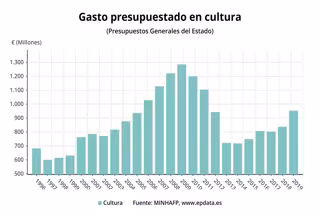 Desde esa fecha, el gasto cultural se ha ido incrementando ligeramente todos los años, salvo en 2017, que hubo una ligera caída del 0,7%, pero aún así, esta última cifra de 2019 está lejos de los 1.284 millones de euros destinados en 2009 --la más alta de las dos últimas décadas--.